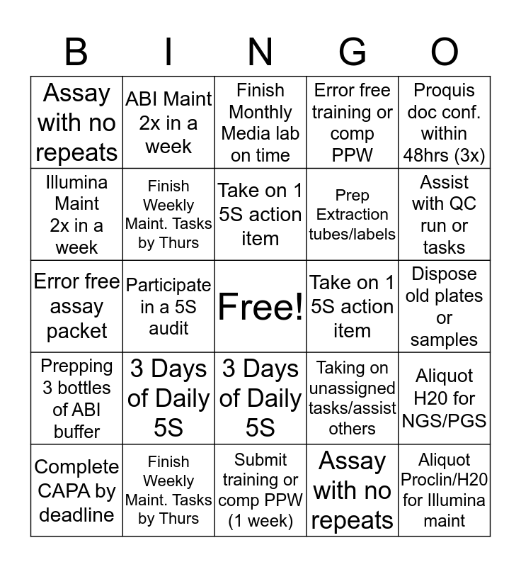 This bingo card has a free space and 24 words: 3 Days of Daily 5S, Finish Weekly Maint. Tasks by Thurs, Take on 1 5S action item, Complete CAPA by deadline, Proquis doc conf. within 48hrs (3x), Assay with no repeats, Illumina Maint 2x in a week, ABI Maint 2x in a week, Take on 1 5S action item, 3 Days of Daily 5S, Prep Extraction tubes/labels, Error free assay packet, Taking on unassigned tasks/assist others, Aliquot H20 for NGS/PGS, Finish Weekly Maint. Tasks by Thurs, Assay with no repeats, Dispose old plates or samples, Finish Monthly Media lab on time, Assist with QC run or tasks, Participate in a 5S audit, Aliquot Proclin/H20 for Illumina maint, Prepping 3 bottles of ABI buffer, Error free training or comp PPW and Submit training or comp PPW (1 week).