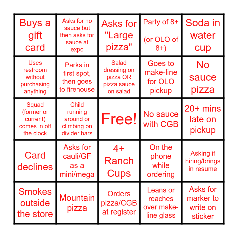 This bingo card has a free space and 27 words: On the phone while ordering, Drink spilled on floor, Goes to make-line for OLO pickup, Orders pizza/CGB at register, Uses restroom without purchasing anything, Asks for "Large pizza", Asks for no sauce but then asks for sauce at expo, Card declines, No sauce with CGB, Asking if hiring/brings in resume, Squad (former or current) comes in off the clock, Party of 8+ (or OLO of 8+), Smokes outside the store, Mountain pizza, No sauce pizza, Orders 2+ beers, Parks in first spot, then goes to firehouse, Salad dressing on pizza OR pizza sauce on salad, Asks for cauli/GF as a mini/mega, Buys a gift card, 20+ mins late on pickup, Leans or reaches over make-line glass, Child running around or climbing on divider bars, Asks for marker to write on sticker, 4+ Ranch Cups, Soda in water cup and Pays with 100 dollar bill.
