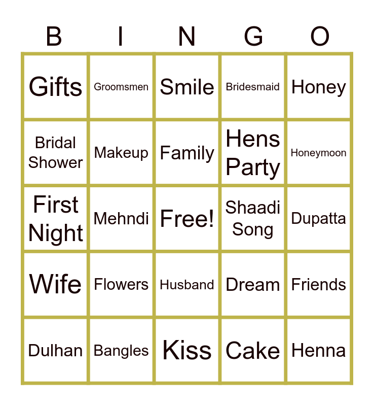 This bingo card has a free space and 29 words: Dulhan, Ring, Mehndi, Joda, Gifts, Smile, Makeup, Flowers, Shaadi Song, Bangles, Dupatta, Henna, Kiss, Cake, Honeymoon, Mr.& Mrs., Husband, Wife, Honey, First Night, Dream, Knot, Hens Party, Bridal Shower, Bridesmaid, Groomsmen, Friends, Family and Baby 🍼.