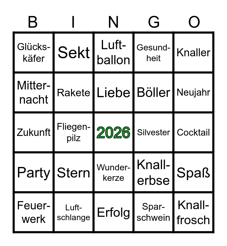 This bingo card has a free space and 34 words: Klee-blatt, Spar-schwein, Glücks-pfennig, Schorn-stein-feger, Party, Rakete, Knaller, Feuer-werk, Sekt, Glück, Liebe, Luft-ballon, Orakel, Konfetti, Silvester, Neujahr, Luft-schlange, Zukunft, Stern, Knall-erbse, Wunder-kerze, Disco, Glücks-käfer, Cocktail, Erfolg, Knall-frosch, Gesund-heit, Lotto, Böller, Mitter-nacht, Huf-eisen, Fliegen-pilz, Spaß and Blei-gießen.