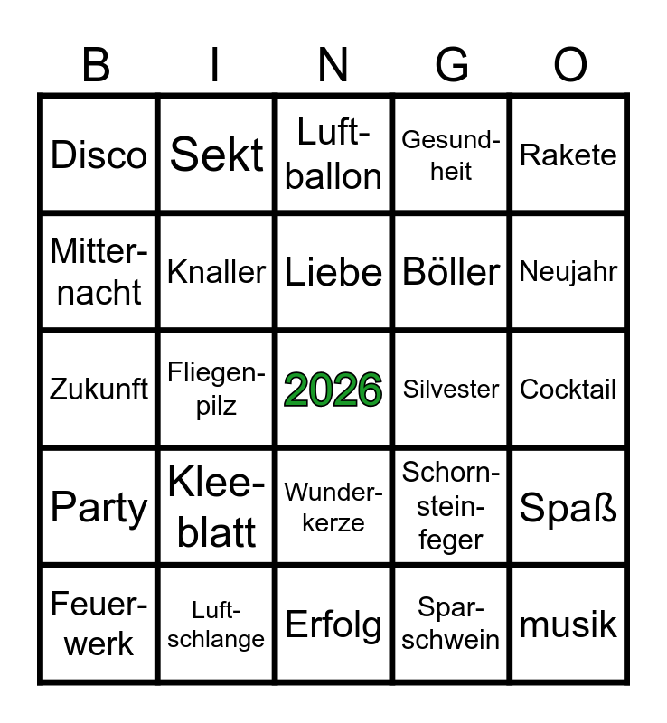 This bingo card has a free space and 34 words: Stern, Spar-schwein, Glücks-pfennig, Knall-erbse, Party, Knaller, Rakete, Feuer-werk, Sekt, Glück, Liebe, Luft-ballon, Orakel, Konfetti, Silvester, Neujahr, Luft-schlange, Zukunft, Klee-blatt, Schorn-stein-feger, Wunder-kerze, Glücks-käfer, Disco, Cocktail, Erfolg, musik, Gesund-heit, Lotto, Böller, Mitter-nacht, Huf-eisen, Fliegen-pilz, Spaß and Blei-gießen.