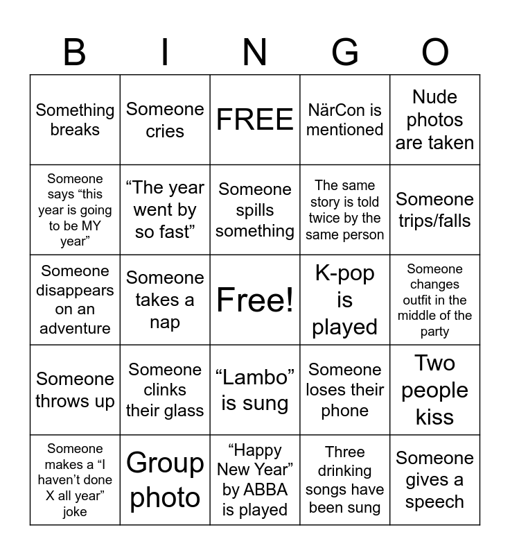 This bingo card has a free space and 36 words: Someone takes a shot, People play a drinking game, People discuss New Year’s resolutions, “The year went by so fast”, Someone loses their phone, Someone throws up, Someone spills something, Spanking happens, Nude photos are taken, Tarot reading happens, Someone takes a nap, NärCon is mentioned, An anime song is played, K-pop is played, Someone trips/falls, Something breaks, Fireworks before midnight, Someone clinks their glass, Someone gives a speech, FREE, Someone changes outfit in the middle of the party, Two people kiss, Group photo, Someone makes a “I haven’t done X all year” joke, “Happy New Year” by ABBA is played, Someone cries, Someone disappears on an adventure, We get visitors from another party, The same story is told twice by the same person, Someone says “this year is going to be MY year”, Someone loses their glass, Declaration of love, Three drinking songs have been sung, “Lambo” is sung, You/your team wins the quiz and You have completed your secret mission.