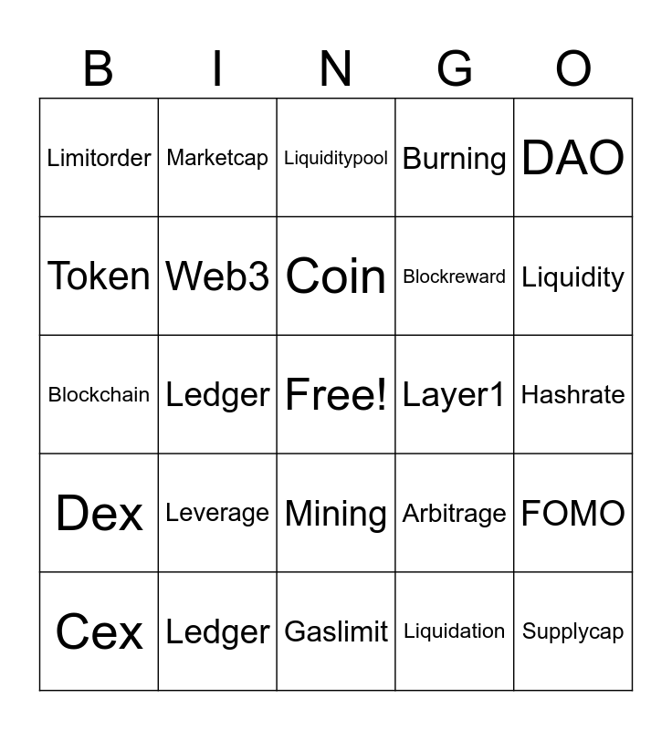 This bingo card has a free space and 156 words: Blockchain, Wallet, token, If you want to join the game, **create your own Bingo card now** using the **template provided** and the **word list below**., π **Important Reminders:**, β You may **print** your card or **edit it digitally** β both are allowed, β Make sure to **send your completed Bingo card** to <#1282946161677828118>, β Donβt forget to use the hashtag **#SANDOPARTY2025**, β 1 Card per** PERSON!**, β° Cards must be submitted **before the event starts**, ---, π― **WORD LIST (Use these to fill your Bingo card):**, Blockchain, Wallet, Token, Coin, Mining, Staking, Liquidity, Exchange, DeFi, NFT, Gas, Smartcontract, Validator, Node, Ledger, Airdrop, Yield, APR, APY, Halving, Mainnet, Testnet, Onchain, Offchain, Bullrun, Bearmarket, FOMO, FUD, Whale, Pump, Dump, Rugpull, Slippage, Arbitrage, Governance, DAO, Multisig, Custodial, Noncustodial, Coldwallet, Hotwallet, Marketcap, Supply, Burning, Minting, Crosschain, Layer1, Layer2, Gaslimit, Hashrate, Difficulty, Blockreward, Proofwork, Proofstake, Liquiditypool, Dex, Cex, Limitorder, Marketorder, Stoploss, Leverage, Liquidation, Volatility, Bullish, Bearish, Web3, Metaverse, Tokenomics, Circulating, Supplycap, Incentives, Buyback, Flashloan, Blockchain, Wallet, Token, Coin, Mining, Staking, Liquidity, Exchange, DeFi, NFT, Gas, Smartcontract, Validator, Node, Ledger, Airdrop, Yield, APR, APY, Halving, Mainnet, Testnet, Onchain, Offchain, Bullrun, Bearmarket, FOMO, FUD, Whale, Pump, Dump, Rugpull, Slippage, Arbitrage, Governance, DAO, Multisig, Custodial, Noncustodial, Coldwallet, Hotwallet, Marketcap, Supply, Burning, Minting, Crosschain, Layer1, Layer2, Gaslimit, Hashrate, Difficulty, Blockreward, Proofwork, Proofstake, Liquiditypool, Dex, Cex, Limitorder, Marketorder, Stoploss, Leverage, Liquidation, Volatility, Bullish, Bearish, Web3, Metaverse, Tokenomics, Circulating, Supplycap and Incentives.
