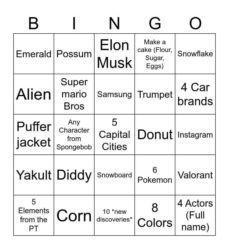 This bingo card has a free space and 24 words: Diddy, Corn, Samsung, 5 Elements from the PT, Snowflake, Emerald, Alien, Possum, Donut, Snowboard, Trumpet, Puffer jacket, 6 Pokemon, Valorant, Super mario Bros, 8 Colors, Instagram, Elon Musk, 4 Car brands, Any Character from Spongebob, 4 Actors (Full name), Yakult, Make a cake (Flour, Sugar, Eggs) and 10 *new discoveries*.