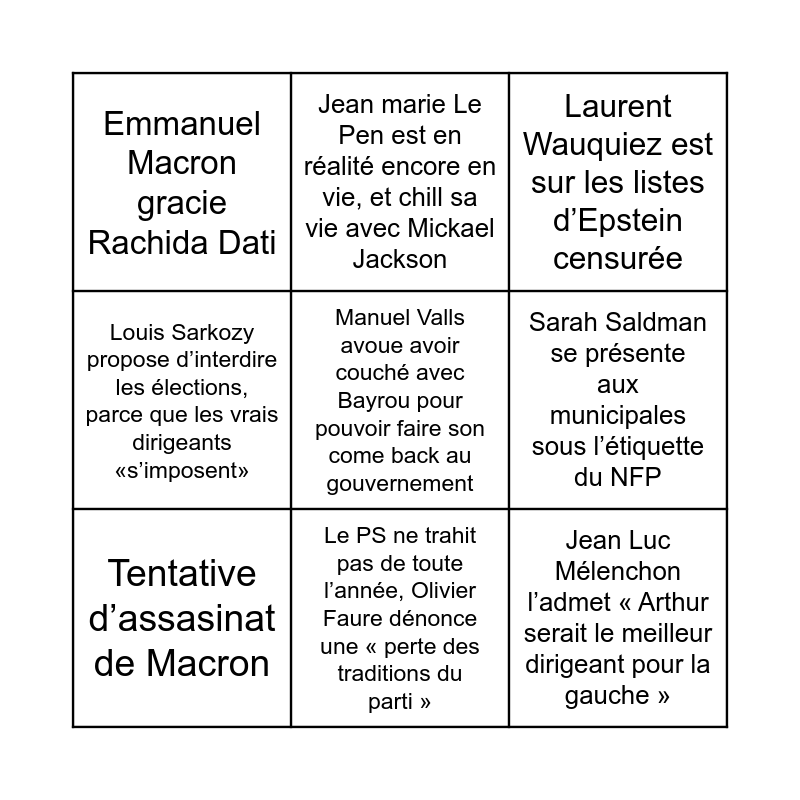 This bingo card has 9 words: Tentative d’assasinat de Macron, Laurent Wauquiez est sur les listes d’Epstein censurée, Jean marie Le Pen est en réalité encore en vie, et chill sa vie avec Mickael Jackson, Louis Sarkozy propose d’interdire les élections, parce que les vrais dirigeants «s’imposent», Emmanuel Macron gracie Rachida Dati, Sarah Saldman se présente aux municipales sous l’étiquette du NFP, Manuel Valls avoue avoir couché avec Bayrou pour pouvoir faire son come back au gouvernement, Jean Luc Mélenchon l’admet « Arthur serait le meilleur dirigeant pour la gauche » and Le PS ne trahit pas de toute l’année, Olivier Faure dénonce une « perte des traditions du parti ».