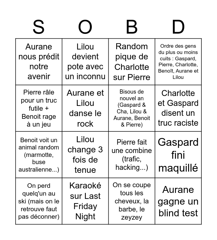This bingo card has 16 words: Karaoké sur Last Friday Night, Gaspard fini maquillé, Random pique de Charlotte sur Pierre, Aurane nous prédit notre avenir, Benoit voit un animal random (marmotte, buse australienne...), Lilou devient pote avec un inconnu, Pierre fait une combine (trafic, hacking...), On se coupe tous les cheveux, la barbe, le zeyzey, Pierre râle pour un truc futile + Benoit rage à un jeu, Aurane et Lilou danse le rock, On perd quelq'un au ski (mais on le retrouve faut pas déconner), Ordre des gens du plus ou moins cuits : Gaspard, Pierre, Charlotte, Benoît, Aurane et Lilou, Lilou change 3 fois de tenue, Charlotte et Gaspard disent un truc raciste, Bisous de nouvel an (Gaspard & Cha, Lilou & Aurane, Benoit & Pierre) and Aurane gagne un blind test.