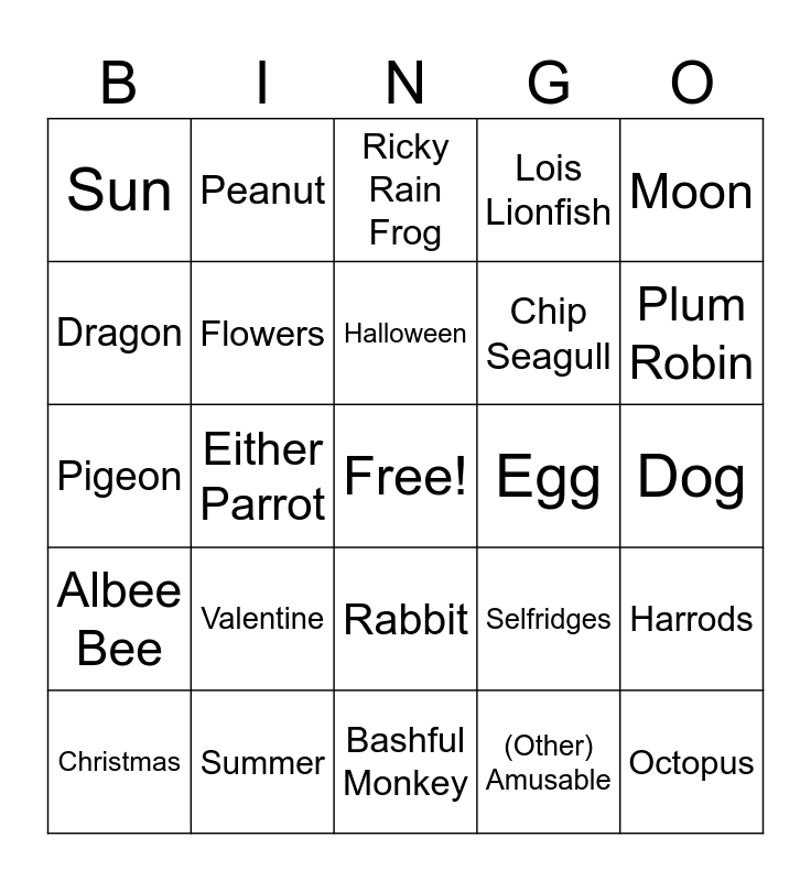This bingo card has a free space and 24 words: Valentine, Summer, Halloween, Christmas, Moon, Sun, Dragon, Peanut, Egg, Rabbit, Chip Seagull, Pigeon, Selfridges, Harrods, Flowers, (Other) Amusable, Dog, Ricky Rain Frog, Plum Robin, Either Parrot, Octopus, Albee Bee, Lois Lionfish and Bashful Monkey.