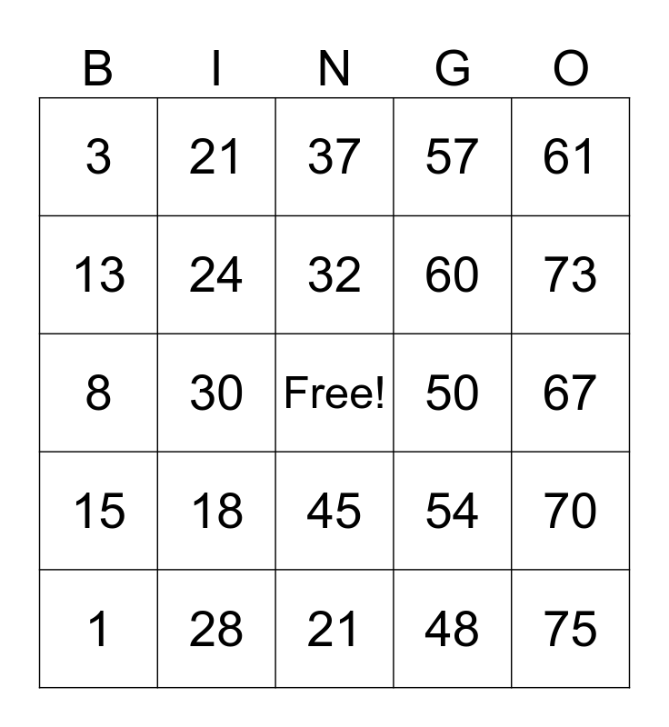 This bingo card has a free space and 24 words: 1, 18, 32, 48, 61, 3, 21, 37, 50, 67, 8, 24, 54, 70, 13, 28, 21, 57, 73, 15, 30, 45, 60 and 75.