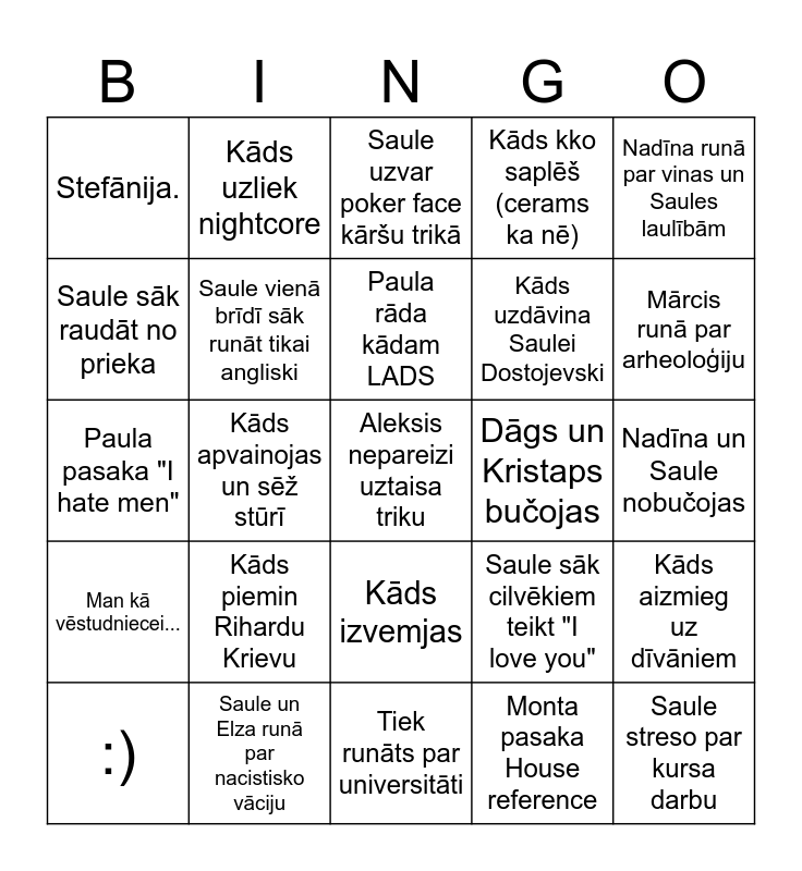This bingo card has a free space and 24 words: Kāds piemin Rihardu Krievu, Saule un Elza runā par nacistisko vāciju, Paula rāda kādam LADS, :), Nadīna runā par vinas un Saules laulībām, Stefānija., Saule sāk raudāt no prieka, Kāds uzliek nightcore, Dāgs un Kristaps bučojas, Kāds izvemjas, Kāds uzdāvina Saulei Dostojevski, Paula pasaka "I hate men", Saule sāk cilvēkiem teikt "I love you", Kāds aizmieg uz dīvāniem, Saule vienā brīdī sāk runāt tikai angliski, Monta pasaka House reference, Nadīna un Saule nobučojas, Saule uzvar poker face kāršu trikā, Mārcis runā par arheoloģiju, Kāds apvainojas un sēž stūrī, Saule streso par kursa darbu, Man kā vēstudniecei..., Kāds kko saplēš (cerams ka nē) and Tiek runāts par universitāti.