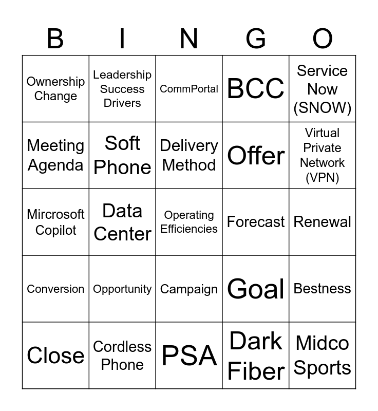 This bingo card has 120 words: Free!, SD-WAN, Access Point (AP), Appointment, Auto Pay, Bandwidth, BCC, BCF, Bestness, Broadband Nutrition Label, Budget, Business Music Choice, Business Name Change, Business Navigator, Business Profile, Business Wi-Fi Pro, Campaign, CAT (carrier authorization) Form, Cellular Failover, Channel Lineup, Close, CommPortal, Community Cable TV, Configuration (config) Form, Construction, Conversion, Cordless Phone, CPNI, CRM, CRM Mobile, Dark Fiber, Data Center, Delivery Method, DIDs, Digital Phone Line, Directory Listing, Disconnect, Downgrade, E911, E-LAN, E-LINE, Email, Enhanced DDoS, Fiber Forward, Field Operations, Firewall, Fixed Wireless, Forecast, Franchise, Frost Cost, FTTP, GIS Maps, Goal, Hierarchy, Internet, IRR, KPI, L3VPN, Lead, Leadership Success Drivers, LinkedIn, Local Area Network (LAN), Long Distance Call Plans, Market (Virtual) Extension Line, Marketing, Meeting Agenda, Microsoft Teams, Midco Sports, Midco.com/business, MidcoTV, Mircrosoft Copilot, Mobile, My Account, Negotiate, NOC, Objections, Offer, Off-Network, Operating Efficiencies, Opportunity, Ownership Change, PBX (Private Branch Exchange), Pipeline, PRI, Pro:Idiom, Prospecting, PSA, Public View Establishments, Publicate, Questions, Quota, Renewal, RFP, Rules of Engagement, Sales Engineer, Sales Stage (CRM), Service Level Agreement (SLA), Service Now (SNOW), Serviceability, Set Top Box (STB), SharePoint, Sidecar, SIP, Site Survey, Snapshot, Soft Phone, Source, Static IP, Streaming, Tableau, Training, Universal Service Fund (USF), Upgrade, Upsell, Virtual Private Network (VPN), Voicemail, VoIP Pro, Wide Area Network (WAN), Wi-Fi and ZoomInfo.
