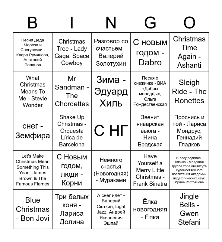 This bingo card has a free space and 84 words: Christmas Saves The Year - twenty one pilots, Last Christmas - Wham!, Разговор со счастьем - Валерий Золотухин, Новый год - Стекловата, Christmas Lights - Orquesta Lírica de Barcelona, Let It Snow, Let It Snow, Let It Snow - Dean Martin, Новогодняя - Дискотека Авария, Rockin' Around The Christmas Tree - Brenda Lee, Зима-холода - Андрей Губин, It's the Most Wonderful Time of the Year - Andy Williams, Happy New Year - ABBA, Santa Tell Me - Ariana Grande, Mr Sandman - The Chordettes, Звенит январская вьюга - Нина Бродская, Снег идёт - Глюк'oZa, Песня Деда Мороза и Снегурочки - Клара Румянова, Анатолий Папанов, Blue Christmas - Bon Jovi, What Christmas Means To Me - Stevie Wonder, White Christmas - The Drifters, Clyde McPhatter, Ирвинг Берлин, Frosty the Snowman - Ella Fitzgerald, С Новым годом, страна! - Uma2rman, Песня о снежинке - ВИА «Добры молодцы», Ольга Рождественская, Jingle Bells - Gwen Stefani, Mistletoe - Justin Bieber, Shake Up Christmas - Orquesta Lírica de Barcelona, Like It's Christmas - Jonas Brothers, Пять минут - Людмила Гурченко, Cozy Little Christmas - Katy Perry, Последний час декабря - Секрет, Песня про зайцев - Юрий Никулин, С Новым годом, люди - Корни, My Only Wish (This Year) - Orquesta Lírica de Barcelona, Step Into Christmas - Elton John, снег - Земфира, Новая новогодняя - VESNA305, Зимняя вишня - Анжелика Варум, А снег идёт - Валерий Сюткин, Light Jazz, Андрей Яковлевич Эшпай, Santa's Beard - The Beach Boys, Sleigh Ride - The Ronettes, Let's Make Christmas Mean Something This Year - James Brown & The Famous Flames, Christmas - Би-2, Песенка о медведях - Аида Ведищева, С Новым годом, крошка! - Мумий Тролль, I Want To Come Home For Christmas - Marvin Gaye, Кабы не было зимы - Валентина Толкунова, Somethin' Stupid - Nancy Sinatra, Frank Sinatra, Christmas Tree - Lady Gaga, Space Cowboy, Начинаем отмечать! - Ленинград, Christmas Tree Farm - Taylor Swift, Новый год! - SEREBRO, Это Новый год - NYUSHA, Have Yourself a Merry Little Christmas - Frank Sinatra, С новым годом - Dabro, Christmas Is Here To Stay! - Bing Crosby, Jack Halloran Singers, I Wish It Could Be Christmas Everyday - Wizzard, Три белых коня - Иванушки International, Три белых коня - Лариса Долина, Зима - Эдуард Хиль, Merry Christmas Baby - Otis Redding, Проснись и пой - Лариса Мондрус, Геннадий Гладков, Синий иней - ВИА «Лейся, песня!», Новогодний поцелуй - Чай вдвоём, The Christmas Song - Ashanti, The Bells of Christmas из фильма «Санта Клаус» - Loreena McKennitt, Zat You Santa Claus? - Louis Armstrong, С Новым годом! (Молодыми) - Руки Вверх!, Lonely Without You (This Christmas) - Mick Jagger, Joss Stone, Новогодняя (Новый Год, С Новой Строчки) - Дима Билан, Christmas Time Again - Ashanti, Новогоднее обращение к народу - Отпетые мошенники, В лесу родилась ёлочка - Младшая группа хора института художественного воспитания Академии педагогических наук, Ирина Ростовцева, Помоги мне - Танго-пародия - Аида Ведищева, Это новый год! - REFLEX, Amor Real - Anitta, Немного счастья (Новогодняя) - Мураками, Ёлка новогодняя - Ёлка, Я спросил у ясеня - Сергей Никитин, Микаэл Леонович Таривердиев, Старый год - Валерий Меладзе, Мне нравится, что вы больны не мной - Алла Пугачёва, Микаэл Леонович Таривердиев, А снег идёт - Майя Кристалинская, Снежинки - Алёна Свиридова, Новогодний вайб - Мари Краймбрери, Ёлка, Динь Дон 2.0 - Ассорти and Ой, мороз, мороз - Юлий Слободкин, Юрий Силантьев.