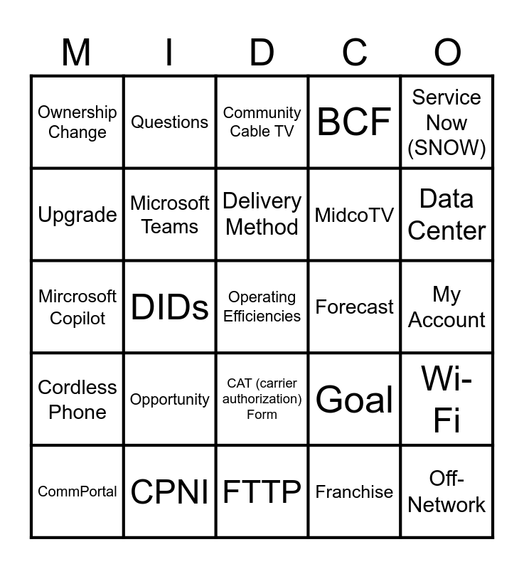 This bingo card has 119 words: SD-WAN, Access Point (AP), Appointment, Auto Pay, Bandwidth, BCC, BCF, Bestness, Broadband Nutrition Label, Budget, Business Music Choice, Business Name Change, Business Navigator, Business Profile, Business Wi-Fi Pro, Campaign, CAT (carrier authorization) Form, Cellular Failover, Channel Lineup, Close, CommPortal, Community Cable TV, Configuration (config) Form, Construction, Conversion, Cordless Phone, CPNI, CRM, CRM Mobile, Dark Fiber, Data Center, Delivery Method, DIDs, Digital Phone Line, Directory Listing, Disconnect, Downgrade, E911, E-LAN, E-LINE, Email, Enhanced DDoS, Fiber Forward, Field Operations, Firewall, Fixed Wireless, Forecast, Franchise, Frost Cost, FTTP, GIS Maps, Goal, Hierarchy, Internet, IRR, KPI, L3VPN, Lead, Leadership Success Drivers, LinkedIn, Local Area Network (LAN), Long Distance Call Plans, Market (Virtual) Extension Line, Marketing, Meeting Agenda, Microsoft Teams, Midco Sports, Midco.com/business, MidcoTV, Mircrosoft Copilot, Mobile, My Account, Negotiate, NOC, Objections, Offer, Off-Network, Operating Efficiencies, Opportunity, Ownership Change, PBX (Private Branch Exchange), Pipeline, PRI, Pro:Idiom, Prospecting, PSA, Public View Establishments, Publicate, Questions, Quota, Renewal, RFP, Rules of Engagement, Sales Engineer, Sales Stage (CRM), Service Level Agreement (SLA), Service Now (SNOW), Serviceability, Set Top Box (STB), SharePoint, Sidecar, SIP, Site Survey, Snapshot, Soft Phone, Source, Static IP, Streaming, Tableau, Training, Universal Service Fund (USF), Upgrade, Upsell, Virtual Private Network (VPN), Voicemail, VoIP Pro, Wide Area Network (WAN), Wi-Fi and ZoomInfo.