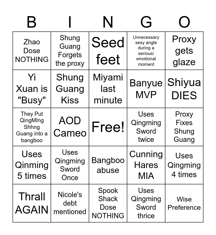 This bingo card has a free space and 24 words: Uses Qingming Sword Once, Nicole's debt mentioned, Miyami last minute, Thrall AGAIN, Proxy gets glaze, Zhao Dose NOTHING, Yi Xuan is "Busy", Shung Guang Forgets the proxy, Uses Qingming Sword twice, Bangboo abuse, Banyue MVP, They Put QingMIng Shhng Guang into a bangboo, Cunning Hares MIA, Uses Qingming 4 times, Shung Guang Kiss, Uses Qingming Sword thrice, Proxy Fixes Shung Guang, Seed feet, Shiyua DIES, AOD Cameo, Wise Preference, Uses Qinming 5 times, Unnecessary sexy angle during a serious/ emotional moment and Spook Shack Dose NOTHING.