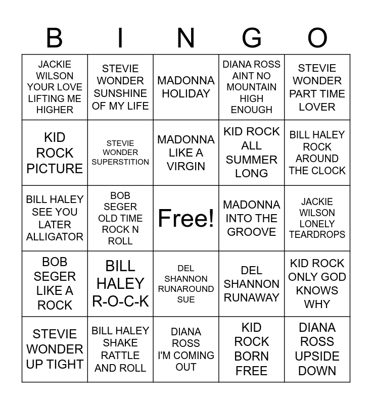 This bingo card has a free space and 33 words: BOB SEGER TURN THE PAGE, BOB SEGER NIGHT MOVES, BOB SEGER OLD TIME ROCK N ROLL, BOB SEGER CEST LA VIE, BOB SEGER LIKE A ROCK, STEVIE WONDER SUPERSTITION, STEVIE WONDER PART TIME LOVER, STEVIE WONDER UP TIGHT, STEVIE WONDER SUNSHINE OF MY LIFE, STEVIE WONDER SIGNED SEALED DELIVERED, MADONNA LIKE A VIRGIN, MADONNA HOLIDAY, MADONNA LUCKY STAR, MADONNA VOGUE, MADONNA INTO THE GROOVE, BILL HALEY ROCK AROUND THE CLOCK, BILL HALEY SHAKE RATTLE AND ROLL, BILL HALEY SEE YOU LATER ALLIGATOR, BILL HALEY R-O-C-K, DEL SHANNON RUNAWAY, DEL SHANNON RUNAROUND SUE, DEL SHANNON NEEDLES AND PINS, JACKIE WILSON YOUR LOVE LIFTING ME HIGHER, JACKIE WILSON LONELY TEARDROPS, DIANA ROSS I'M COMING OUT, DIANA ROSS UPSIDE DOWN, DIANA ROSS AINT NO MOUNTAIN HIGH ENOUGH, KID ROCK ALL SUMMER LONG, KID ROCK PICTURE, KID ROCK ONLY GOD KNOWS WHY, KID ROCK COWBOY, KID ROCK BORN FREE and KID ROCK SO HOT.