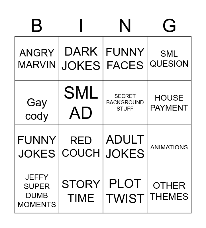 This bingo card has 16 words: STORY TIME, ANIMATIONS, FUNNY FACES, ANGRY MARVIN, FUNNY JOKES, DARK JOKES, ADULT JOKES, PLOT TWIST, Gay cody, SML AD, JEFFY SUPER DUMB MOMENTS, SML QUESION, RED COUCH, HOUSE PAYMENT, SECRET BACKGROUND STUFF and OTHER THEMES.