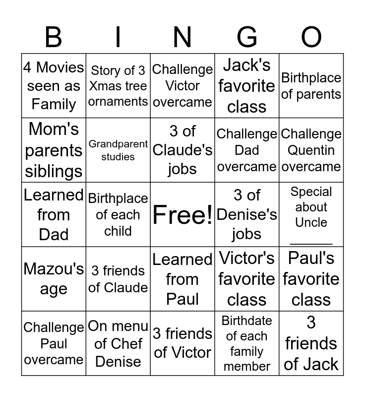 This bingo card has a free space and 51 words: 3 friends of Quentin, 3 friends of Jack, 3 friends of Paul, 3 friends of Victor, 3 friends of Claude, 3 friends of Denise, Story of 3 Xmas tree ornaments, Dad's parents siblings, Mom's parents siblings, 2 blooper meals, Grandparent studies, Jack's favorite class, Paul's favorite class, Victor's favorite class, Quentin's favorite class, Funny phrases of each kid, 3 of Claude's jobs, 3 of Denise's jobs, Birthplace of grandparents, Birthplace of parents, Birthplace of each child, Birthdate of each family member, 4 Movies seen as Family, Challenge Dad overcame, Challenge Mom overcame, Sibling achievement this year, Challenge Quentin overcame, Challenge Jack overcame, Challenge Paul overcame, Challenge Victor overcame, On menu of Chef Quentin, On menu of Chef Paul, On menu of Chef Jack, On menu of Chef Victor, On menu of Chef Claude, On menu of Chef Denise, On menu of Chef Aunt ____, On menu of Chef Uncle ____, Special about Aunt ____, Special about Cousin _____, Special about Uncle ______, Mazou's age, DaddyMac's age, Parents' age, Siblings' age, Learned from Mom, Learned from Dad, Learned from Quentin, Learned from Jack, Learned from Paul and Learned from Victor.