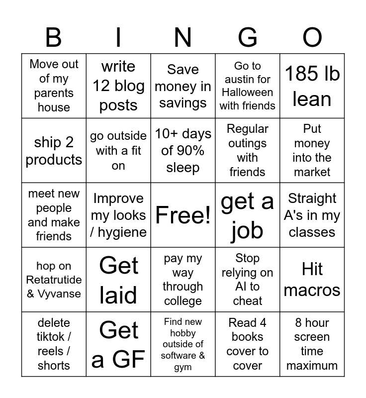 This bingo card has a free space and 24 words: Get laid, Get a GF, 10+ days of 90% sleep, delete tiktok / reels / shorts, 185 lb lean, Move out of my parents house, ship 2 products, write 12 blog posts, get a job, pay my way through college, Regular outings with friends, meet new people and make friends, Stop relying on AI to cheat, Hit macros, go outside with a fit on, Read 4 books cover to cover, Straight A's in my classes, Save money in savings, Put money into the market, Improve my looks / hygiene, 8 hour screen time maximum, hop on Retatrutide & Vyvanse, Go to austin for Halloween with friends and Find new hobby outside of software & gym.