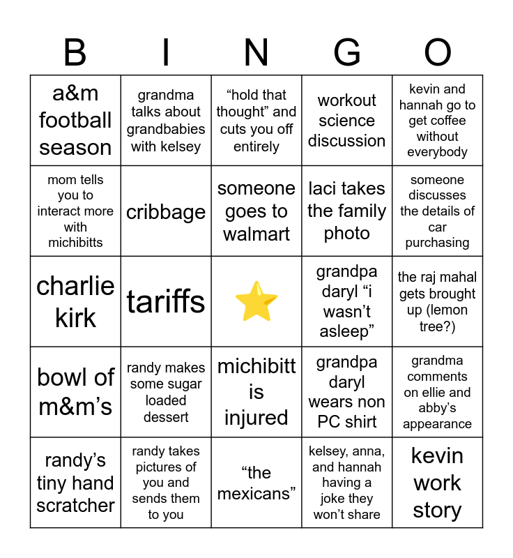 This bingo card has a free space and 34 words: grandma references “somebody’s awake” etc., kelsey, anna, and hannah having a joke they won’t share, mom steals everett from you, grandma talks extensively about someone you don’t know, bowl of m&m’s, cribbage, kevin and hannah go to get coffee without everybody, randy’s tiny hand scratcher, grandma talks about grandbabies with kelsey, aunt karlene says “correct”, someone goes to walmart, “hold that thought” and cuts you off entirely, michibitts bring odd postmodern card game, noah talks over you, grandpa daryl “i wasn’t asleep”, someone discusses the details of car purchasing, randy takes pictures of you and sends them to you, charlie kirk, randy makes some sugar loaded dessert, grandpa daryl wears non PC shirt, michibitt is injured, salt jokes, a&m football season, the raj mahal gets brought up (lemon tree?), “the mexicans”, kevin work story, workout science discussion, uncomfortable conversations between grandma and laci, laci takes the family photo, mom tells you to interact more with michibitts, grandpa talks about his eating habits, tariffs, grandma comments on ellie and abby’s appearance and aunt val.