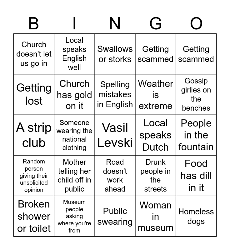 This bingo card has a free space and 24 words: Mother telling her child off in public, Museum people asking where you're from, Spelling mistakes in English, Broken shower or toilet, Getting scammed, Church doesn't let us go in, Getting lost, Local speaks English well, Local speaks Dutch, Road doesn't work ahead, Weather is extreme, A strip club, Drunk people in the streets, Food has dill in it, Church has gold on it, Woman in museum, People in the fountain, Swallows or storks, Gossip girlies on the benches, Someone wearing the national clothing, Homeless dogs, Random person giving their unsolicited opinion, Getting scammed and Public swearing.