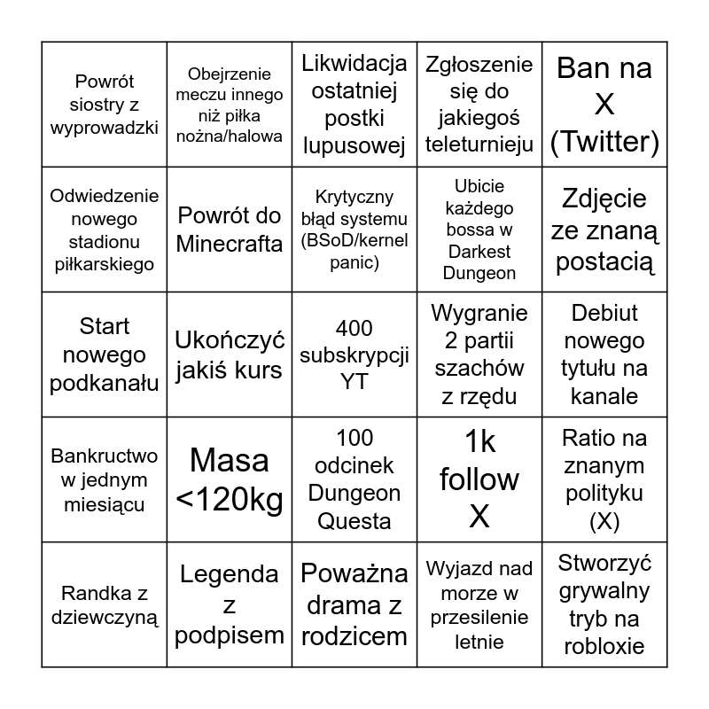 This bingo card has a free space and 24 words: Masa <120kg, Legenda z podpisem, Krytyczny błąd systemu (BSoD/kernel panic), Randka z dziewczyną, Ban na X (Twitter), Powrót siostry z wyprowadzki, Odwiedzenie nowego stadionu piłkarskiego, Obejrzenie meczu innego niż piłka nożna/halowa, Wygranie 2 partii szachów z rzędu, 100 odcinek Dungeon Questa, Ubicie każdego bossa w Darkest Dungeon, Start nowego podkanału, 1k follow X, Ratio na znanym polityku (X), Powrót do Minecrafta, Wyjazd nad morze w przesilenie letnie, Debiut nowego tytułu na kanale, Likwidacja ostatniej postki lupusowej, Zdjęcie ze znaną postacią, Ukończyć jakiś kurs, Stworzyć grywalny tryb na robloxie, Bankructwo w jednym miesiącu, Zgłoszenie się do jakiegoś teleturnieju and Poważna drama z rodzicem.