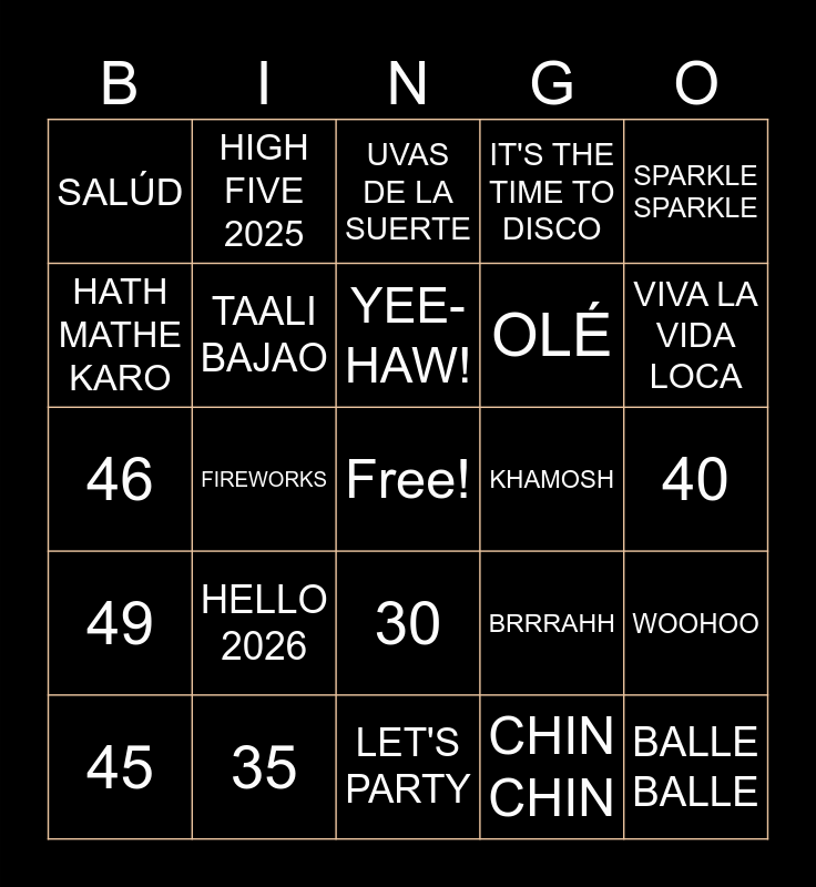 This bingo card has a free space and 50 words: VADAYUN, BALLE BALLE, LET'S NACHO, LET'S PARTY, HELLO 2026, LAL JHULELAL, HIGH FIVE 2025, HIP HIP HOORAY, HATH MATHE KARO, POP THE CONFETTI, TAALI BAJAO, IT'S THE TIME TO DISCO, WOOHOO, BRRRAHH, CHEERS, HA HA HA!, YEE-HAW!, KHAMOSH, AREY WAH, SPARKLE SPARKLE, FIREWORKS, CHIN CHIN, SALÚD, OLÉ, VIVA LA FIESTA, QUE EL RITMO NO PARE, VIVA LA VIDA LOCA, BRAVO, UVAS DE LA SUERTE, 30, 31, 32, 33, 34, 35, 36, 37, 38, 39, 40, 41, 42, 43, 44, 45, 46, 47, 48, 49 and 50.