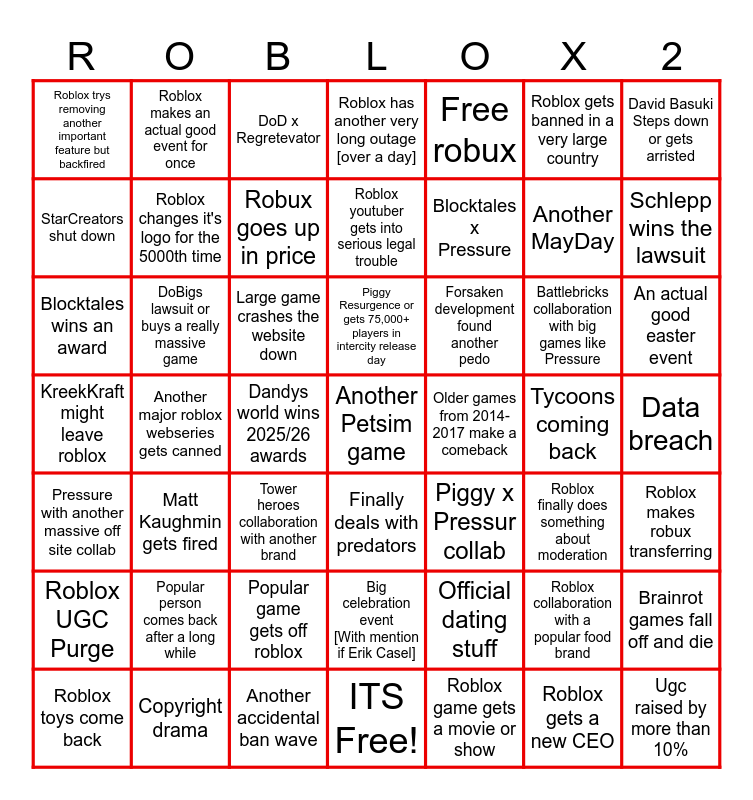 This bingo card has 49 words: Roblox UGC Purge, DoBigs lawsuit or buys a really massive game, Popular game gets off roblox, Finally deals with predators, Forsaken development found another pedo, Tycoons coming back, David Basuki Steps down or gets arristed, Roblox toys come back, Roblox changes it's logo for the 5000th time, Dandys world wins 2025/26 awards, Roblox youtuber gets into serious legal trouble, Free robux, Another MayDay, An actual good easter event, Pressure with another massive off site collab, Matt Kaughmin gets fired, DoD x Regretevator, Piggy Resurgence or gets 75,000+ players in intercity release day, Roblox game gets a movie or show, Roblox gets banned in a very large country, Schlepp wins the lawsuit, StarCreators shut down, Roblox makes an actual good event for once, Robux goes up in price, ITS Free!, Blocktales x Pressure, Battlebricks collaboration with big games like Pressure, Brainrot games fall off and die, Roblox trys removing another important feature but backfired, Another major roblox webseries gets canned, Another accidental ban wave, Big celebration event [With mention if Erik Casel], Piggy x Pressur collab, Roblox collaboration with a popular food brand, Data breach, KreekKraft might leave roblox, Popular person comes back after a long while, Tower heroes collaboration with another brand, Another Petsim game, Older games from 2014-2017 make a comeback, Roblox gets a new CEO, Roblox makes robux transferring, Blocktales wins an award, Copyright drama, Large game crashes the website down, Roblox has another very long outage [over a day], Official dating stuff, Roblox finally does something about moderation and Ugc raised by more than 10%.