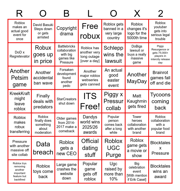 This bingo card has a free space and 48 words: Roblox UGC Purge, DoBigs lawsuit or buys a really massive game, Popular game gets off roblox, Finally deals with predators, Forsaken development found another pedo, Tycoons coming back, David Basuki Steps down or gets arristed, Roblox toys come back, Roblox changes it's logo for the 5000th time, Dandys world wins 2025/26 awards, Roblox youtuber gets into serious legal trouble, Free robux, Another MayDay, An actual good easter event, Pressure with another massive off site collab, Matt Kaughmin gets fired, DoD x Regretevator, Piggy Resurgence or gets 75,000+ players in intercity release day, Roblox game gets a movie or show, Roblox gets banned in a very large country, Schlepp wins the lawsuit, StarCreators shut down, Roblox makes an actual good event for once, Robux goes up in price, Blocktales x Pressure, Battlebricks collaboration with big games like Pressure, Brainrot games fall off and die, Roblox trys removing another important feature but backfired, Another major roblox webseries gets canned, Another accidental ban wave, Big celebration event [With mention if Erik Casel], Piggy x Pressur collab, Roblox collaboration with a popular food brand, Data breach, KreekKraft might leave roblox, Popular person comes back after a long while, Tower heroes collaboration with another brand, Another Petsim game, Older games from 2014-2017 make a comeback, Roblox gets a new CEO, Roblox makes robux transferring, Blocktales wins an award, Copyright drama, Large game crashes the website down, Roblox has another very long outage [over a day], Official dating stuff, Roblox finally does something about moderation and Ugc raised by more than 10%.
