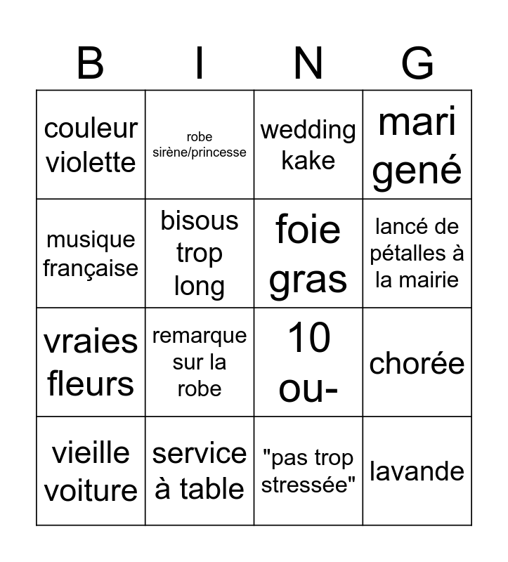 This bingo card has 16 words: service à table, chorée, wedding kake, couleur violette, vraies fleurs, robe sirène/princesse, 10 ou-, "pas trop stressée", musique française, bisous trop long, vieille voiture, mari gené, remarque sur la robe, lancé de pétalles à la mairie, foie gras and lavande.