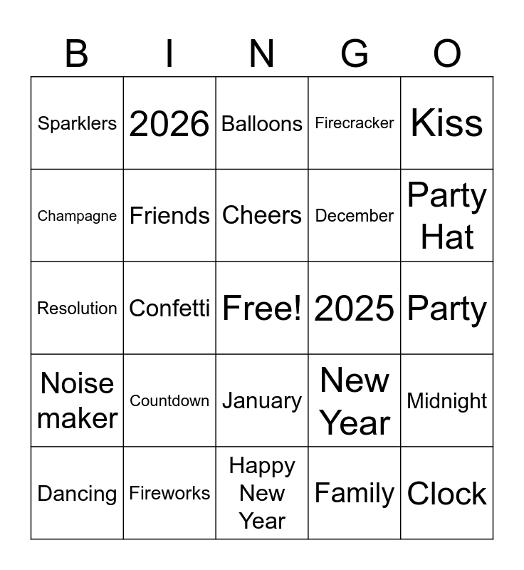 This bingo card has a free space and 24 words: Countdown, Fireworks, Cheers, Dancing, Kiss, Sparklers, Champagne, 2026, 2025, January, December, Resolution, New Year, Midnight, Friends, Family, Party, Balloons, Party Hat, Confetti, Clock, Noise maker, Firecracker and Happy New Year.