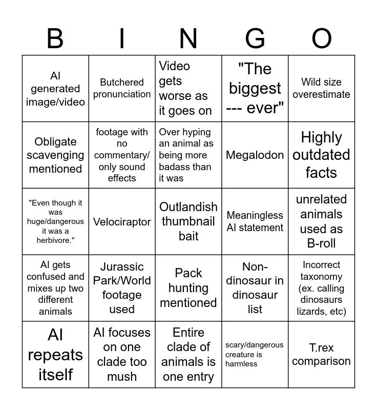 This bingo card has a free space and 24 words: Jurassic Park/World footage used, AI focuses on one clade too mush, Over hyping an animal as being more badass than it was, AI repeats itself, Wild size overestimate, AI generated image/video, Obligate scavenging mentioned, Butchered pronunciation, Meaningless AI statement, Pack hunting mentioned, Megalodon, "Even though it was huge/dangerous it was a herbivore.", Non-dinosaur in dinosaur list, Incorrect taxonomy (ex. calling dinosaurs lizards, etc), footage with no commentary/ only sound effects, scary/dangerous creature is harmless, unrelated animals used as B-roll, Video gets worse as it goes on, Highly outdated facts, Velociraptor, T.rex comparison, AI gets confused and mixes up two different animals, "The biggest --- ever" and Entire clade of animals is one entry.