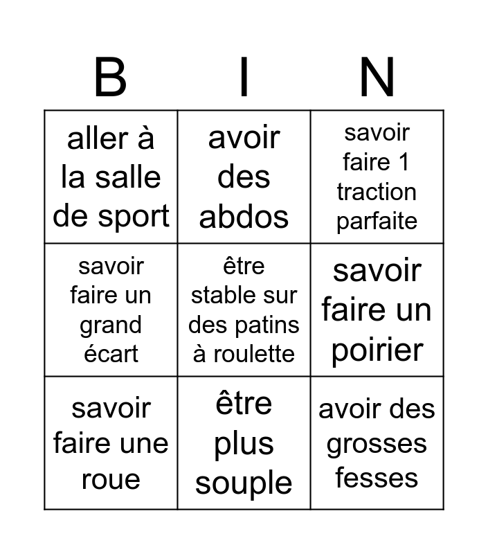 This bingo card has a free space and 8 words: savoir faire un poirier, savoir faire 1 traction parfaite, avoir des abdos, savoir faire une roue, aller à la salle de sport, avoir des grosses fesses, savoir faire un grand écart and être plus souple.