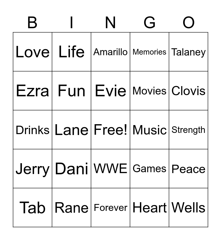 This bingo card has a free space and 24 words: Dani, Rane, Evie, Tab, Talaney, Love, Ezra, Life, Music, WWE, Movies, Drinks, Games, Peace, Fun, Heart, Strength, Amarillo, Clovis, Lane, Wells, Jerry, Memories and Forever.