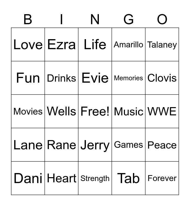 This bingo card has a free space and 24 words: Dani, Rane, Evie, Tab, Talaney, Love, Ezra, Life, Music, WWE, Movies, Drinks, Games, Peace, Fun, Heart, Strength, Amarillo, Clovis, Lane, Wells, Jerry, Memories and Forever.