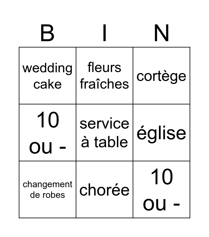 This bingo card has 10 words: chorée, cortège, wedding cake, service à table, 10 ou -, changement de robes, fleurs fraîches, discours, église and 10 ou -.