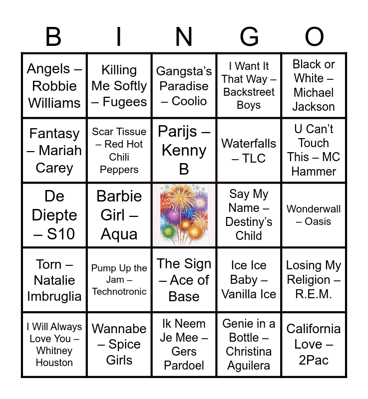 This bingo card has a free space and 70 words: Smells Like Teen Spirit – Nirvana, Wonderwall – Oasis, My Heart Will Go On – Céline Dion, …Baby One More Time – Britney Spears, Wannabe – Spice Girls, No Scrubs – TLC, I Want It That Way – Backstreet Boys, Believe – Cher, Black or White – Michael Jackson, Vogue – Madonna, Losing My Religion – R.E.M., Zombie – The Cranberries, Angels – Robbie Williams, Gangsta’s Paradise – Coolio, Everybody – Backstreet Boys, Barbie Girl – Aqua, The Sign – Ace of Base, Waterfalls – TLC, Bitter Sweet Symphony – The Verve, Torn – Natalie Imbruglia, Say My Name – Destiny’s Child, Ice Ice Baby – Vanilla Ice, U Can’t Touch This – MC Hammer, Macarena – Los del Rio, Rhythm Is a Dancer – Snap!, No Limit – 2 Unlimited, Blue (Da Ba Dee) – Eiffel 65, Livin’ la Vida Loca – Ricky Martin, Genie in a Bottle – Christina Aguilera, Don’t Speak – No Doubt, Killing Me Softly – Fugees, Everybody’s Got to Learn Sometime – Korgis, Stay (I Missed You) – Lisa Loeb, Smooth – Santana ft. Rob Thomas, Friday I’m in Love – The Cure, Basket Case – Green Day, Nothing Compares 2 U – Sinéad O’Connor, What Is Love – Haddaway, Around the World – Daft Punk, Fantasy – Mariah Carey, You Oughta Know – Alanis Morissette, Pump Up the Jam – Technotronic, California Love – 2Pac, Creep – Radiohead, Semi-Charmed Life – Third Eye Blind, Scar Tissue – Red Hot Chili Peppers, I Will Always Love You – Whitney Houston, Strong Enough – Cher, Mr. Vain – Culture Beat, Freed from Desire – Gala, Zoutelande – BLØF ft. Geike Arnaert, Drank & Drugs – Lil Kleine & Ronnie Flex, Hoe Het Danst – Armin van Buuren & Davina M, Duurt Te Lang – Davina Michelle, Ik Neem Je Mee – Gers Pardoel, Blijven Slapen – Snelle & Maan, Parijs – Kenny B, Niemand – Nick & Simon, Als Het Avond Is – Suzan & Freek, Blauwe Dag – Suzan & Freek, De Diepte – S10, Adem Je In – S10, Dat Is Het Leven – Rene Froger, Terug Naar De Kust – Maggie MacNeal, Alles Is Liefde – BLØF, Het Is Een Nacht – Guus Meeuwis, Door De Wind – Miss Montreal, Jij Bent De Liefde – Jaap Reesema, Over De Muur – Klein Orkest and Laat Me – Ramses Shaffy.