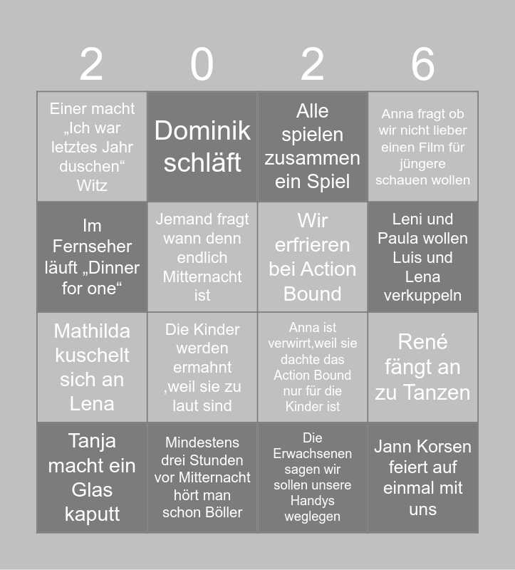 This bingo card has 16 words: Mindestens drei Stunden vor Mitternacht hört man schon Böller, René fängt an zu Tanzen, Alle spielen zusammen ein Spiel, Einer macht „Ich war letztes Jahr duschen“ Witz, Mathilda kuschelt sich an Lena, Dominik schläft, Anna ist verwirrt,weil sie dachte das Action Bound nur für die Kinder ist, Die Erwachsenen sagen wir sollen unsere Handys weglegen, Im Fernseher läuft „Dinner for one“, Jemand fragt wann denn endlich Mitternacht ist, Tanja macht ein Glas kaputt, Anna fragt ob wir nicht lieber einen Film für jüngere schauen wollen, Die Kinder werden ermahnt ,weil sie zu laut sind, Leni und Paula wollen Luis und Lena verkuppeln, Wir erfrieren bei Action Bound and Jann Korsen feiert auf einmal mit uns.