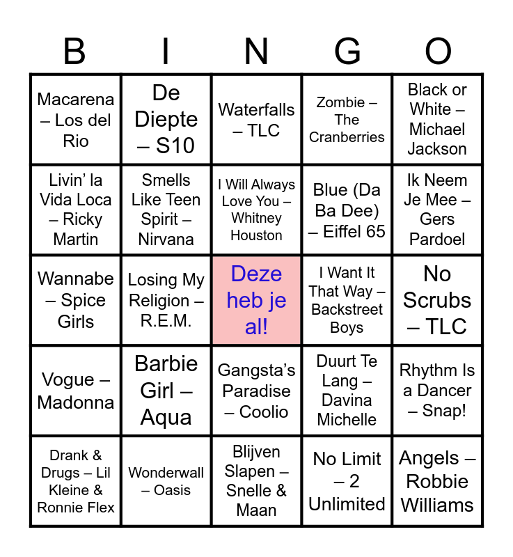 This bingo card has a free space and 40 words: …Baby One More Time – Britney Spears, Wannabe – Spice Girls, My Heart Will Go On – Céline Dion, Smells Like Teen Spirit – Nirvana, Wonderwall – Oasis, Gangsta’s Paradise – Coolio, I Will Always Love You – Whitney Houston, Believe – Cher, Black or White – Michael Jackson, Vogue – Madonna, Losing My Religion – R.E.M., Zombie – The Cranberries, Angels – Robbie Williams, No Scrubs – TLC, I Want It That Way – Backstreet Boys, Barbie Girl – Aqua, The Sign – Ace of Base, Macarena – Los del Rio, Torn – Natalie Imbruglia, Waterfalls – TLC, Rhythm Is a Dancer – Snap!, No Limit – 2 Unlimited, Blue (Da Ba Dee) – Eiffel 65, Livin’ la Vida Loca – Ricky Martin, Don’t Speak – No Doubt, Killing Me Softly – Fugees, Mr. Vain – Culture Beat, Nothing Compares 2 U – Sinéad O’Connor, What Is Love – Haddaway, Smooth – Santana ft. Rob Thomas, Zoutelande – BLØF ft. Geike Arnaert, Drank & Drugs – Lil Kleine & Ronnie Flex, Hoe Het Danst – Marco Borsato, Armin van Buuren & Davina Michelle, Duurt Te Lang – Davina Michelle, Ik Neem Je Mee – Gers Pardoel, Blijven Slapen – Snelle & Maan, Parijs – Kenny B, Als Het Avond Is – Suzan & Freek, De Diepte – S10 and Jij Bent De Liefde – Jaap Reesema.