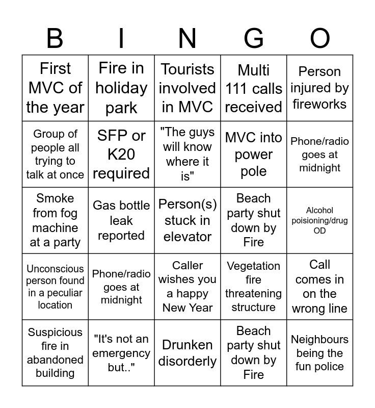 This bingo card has 25 words: Phone/radio goes at midnight, Drunken disorderly, "The guys will know where it is", Suspicious fire in abandoned building, Person injured by fireworks, First MVC of the year, Group of people all trying to talk at once, Fire in holiday park, Beach party shut down by Fire, Caller wishes you a happy New Year, MVC into power pole, Smoke from fog machine at a party, Vegetation fire threatening structure, Call comes in on the wrong line, SFP or K20 required, Neighbours being the fun police, Alcohol poisioning/drug OD, Tourists involved in MVC, Phone/radio goes at midnight, Gas bottle leak reported, Person(s) stuck in elevator, "It's not an emergency but..", Unconscious person found in a peculiar location, Multi 111 calls received and Beach party shut down by Fire.