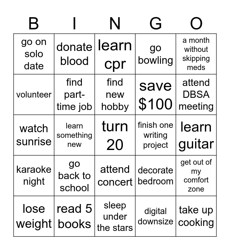 This bingo card has a free space and 24 words: go back to school, read 5 books, find new hobby, lose weight, a month without skipping meds, go on solo date, volunteer, donate blood, finish one writing project, attend concert, save $100, watch sunrise, decorate bedroom, get out of my comfort zone, find part-time job, digital downsize, learn guitar, learn cpr, attend DBSA meeting, learn something new, take up cooking, karaoke night, go bowling and sleep under the stars.