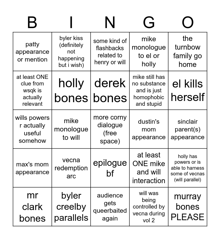 This bingo card has a free space and 39 words: painting is addressed, byler plot twist, lumax endgame, holly bones, mr clark bones, epilogue bf, derek bones, half of the kids in camozotz die, the turnbow family go home, max's mom appearance, mike monologue to will, mike monologue to el or holly, murray bones PLEASE, sinclair parent(s) appearance, dustin's mom appearance, vecna redemption arc, vecna lore from tfs gets brought back, patty appearance or mention, mindflayer confirmed to be the big daddy of dimension x, at least ONE mike and will interaction, at least ONE clue from wsqk is actually relevant, audience gets queerbaited again, mike still has no substance and is just homophobic and stupid, el kills herself, el goes into secret hiding (fakeout death), karen wheeler bones, ted wheeler bones, mike gets vecnad, will turns evil/gets possessed by vecna or the mindflayer, byler kiss (definitely not happening but i wish), will gets a satisfactory ending, will's past trauma with sa gets addressed, some kind of flashbacks related to henry or will, byler creelby parallels, will was being controlled by vecna during vol 2, the viewer was seeing vol 2 thru vecnas eyes, holly has powers or is able to harness some of vecnas (will parallel), wills powers r actually useful somehow and steve fakeout or close to death.