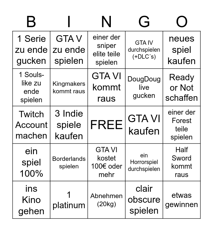 This bingo card has a free space and 24 words: Borderlands spielen, 1 platinum, GTA VI kommt raus, ins Kino gehen, neues spiel kaufen, 1 Serie zu ende gucken, 1 Souls-like zu ende spielen, GTA V zu ende spielen, GTA VI kaufen, GTA VI kostet 100€ oder mehr, DougDoug live gucken, Twitch Account machen, ein Horrorspiel durchspielen, Half Sword kommt raus, Kingmakers kommt raus, clair obscure spielen, einer der Forest teile spielen, einer der sniper elite teile spielen, Ready or Not schaffen, 3 Indie spiele kaufen, etwas gewinnen, ein spiel 100%, GTA IV durchspielen (+DLC´s) and Abnehmen (20kg).