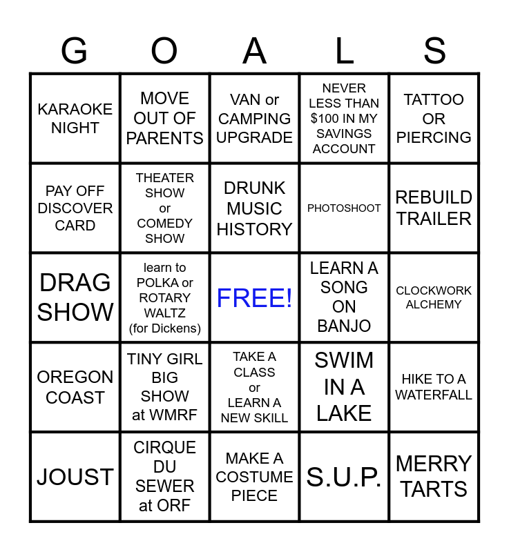 This bingo card has a free space and 24 words: TINY GIRL BIG SHOW at WMRF, CIRQUE DU SEWER at ORF, DRUNK MUSIC HISTORY, JOUST, TATTOO OR PIERCING, KARAOKE NIGHT, PAY OFF DISCOVER CARD, MOVE OUT OF PARENTS, LEARN A SONG ON BANJO, TAKE A CLASS or LEARN A NEW SKILL, PHOTOSHOOT, DRAG SHOW, SWIM IN A LAKE, HIKE TO A WATERFALL, THEATER SHOW or COMEDY SHOW, S.U.P., CLOCKWORK ALCHEMY, VAN or CAMPING UPGRADE, REBUILD TRAILER, learn to POLKA or ROTARY WALTZ (for Dickens), MERRY TARTS, OREGON COAST, NEVER LESS THAN $100 IN MY SAVINGS ACCOUNT and MAKE A COSTUME PIECE.