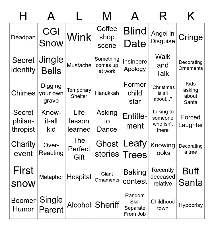This bingo card has 256 words: Flannel, Red dress, Decorating a tree, Interrupted kiss, Cute animal, Willfull child, Secret Santa, Mall Santa, Town fair, Childhood town, Mythical Creature, Famous actor, Sleigh or carriage ride, Childhood flashback, Christmas shopping, Abandonment, Pick up truck, Life lesson learned, Cute local bakery, Something comes up at work, Pensive car ride, Single parent, Step relationship, Taking a stroll, Cringe, High school friend, Making family recipe, Good advice, Snowman, Marriage, Carol singing, Photo shooting, Classical music, Ghost stories, Overbearing relative, Cuter without glasses, Christmas Carol, Nativity, Christmas Miracle, Crisis of faith, Secret philan-thropist, Diagetic music, Making cookies, Writing Christmas cards, Car trouble, Former child star, Ugly Christmas sweater, Mistletoe Encounter, Christmas-inspired name, Baking contest, Promotion opportunity, Coffee shop scene, First snow, Town needs help, Drinking hot cocoa, Unexpected gift, Reindeer, Santa or Christmas isn't real, Old flame, Bumping into love interest, Reveals true feelings, Divorce, Talking animals, Missed flight, Misunder-standing, Orphan, Snowball fight, Watching an old movie, Kiss without consent, Buff Santa, Product Placement, Candles, Recently deceased relative, Family Business, Christmas Star, Playing an instrument, Spontaneous Caroling or Dancing, Volunteer-ing, Lies, Cheating, Widow, Confession Scene, Amnesia, Groundhog Day, A New Christmas Song, Cheese, Eggnog, Fireplace, Smalltown Girl, City Boy, Sheriff, Doctor, Elevator, Mittens, Sarcasm, Family Banter, As you know..., Calendar Conflict, Quirky Music, Boomer Humor, Creepy Christmas Decoration, Christmas Competition, Metaphor, Loneliness, Blind Date, "Jolly", "Bah Humbug", CGI Snow, Fruit Cake, New Neighbors, Starving Artist, Striped socks, Lost Muse, Talking about missing parent, Christmas Pagent, Decorating Ornaments, Tree Lighting, "Christmas is all about...", Obsessive Planner, "Best Christmas Ever!", Kids asking about Santa, Tchaik-ovsky, The Real Santa, Wink, Awkward Encounter, Can't Stay For Long, Holiday Pun, Childhood Flashback, Love Triangle, Former Child Star, Phone Won't Work, Random Skill Separate From Job, Busy Business-person, Weather ruins plans, Sweater with elbow patches, "Christmas is ruined!", "Spirit of Christmas", Bible Verse, Giant Ornaments, Forced Laughter, Boundary Crossing, Repairing Something, Ice Skating, Awkward Editting, Hanukkah, Insincere Apology, Angel in Disguise, Precaution-ary Tale, Unsolicited Advice, Christmas Wish, Silent Smiling, Passive Agression, Forced Family Activity, Compro-mise, Comparing to relative, Jesus, Change Subject, Overheard Misunder-standing, Talking to someone who isn't there, Know-it-all kid, One-liner, Dramatic Entrance, Foreign Accent, Is this a date?, Mustache, Winter Injury, The Perfect Gift, Evil Boss, Opposites Attract, Walk and Talk, Single Parent, Visit to the North Pole, Vintage Car, Leafy Trees, Nosy Friend, Travel to Another Country, Crime, Train, Slow Motion, Explosion, Death, Hospital, Chimes, Jingle Bells, A Deal with Strings Attached, Dubbed, Letterman Jacket, Ballet, Victorian Outfit, 12 Days of..., A Sport, Asking to Dance, Self-Centered, That's the Name of the Movie!, Hypocrisy, Acceptance Letter, Reindeer Antlers, Deadline, Christmas Background Music, Upcoming Payment, Handshake, Family Heirloom, Airport, Voiceover, Entitle- ment, Street corner santa, Bad driving, Richy Rich- Person, Faux Pas, Charity event, Denial, Over- Reacting, Tightly- knit community, Sincere apology, Big city, Eaves- Dropping, Gossip, Jazz, Petty, Product Placement, Deadpan, Digging your own grave, Clueless Newcomer, Temporary Shelter, Innuendo, "It's Christmas", Snooping, Epiphany, A favor, Bribed with food, Veneers, Passive aggression, Secret identity, Just friends, Consumer- ism, Staulking, Internet research, Knowing looks, Invisible orchestra, Christmas craft, Broken promise, Deathbed repentance, Makeover, Split-screen, Canadian actor, Utah scenery, Empty spot in the audience, That's not how tech works..., Techno-logical isolation, Alcohol, Fruitcake, Jack of all trades, Travel montage, Traffic, Family visit and "I hate Christmas".