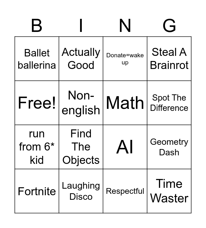 This bingo card has 16 words: Laughing Disco, Geometry Dash, Donate=wake up, Ballet ballerina, run from 6* kid, Actually Good, AI, Respectful, Free!, Non-english, Fortnite, Steal A Brainrot, Find The Objects, Spot The Difference, Math and Time Waster.