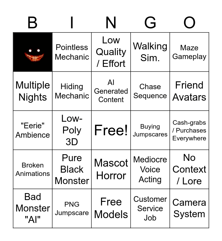 This bingo card has 1 images, a free space and 23 words: Pure Black Monster, PNG Jumpscare, AI Generated Content, Bad Monster "AI", Maze Gameplay, Multiple Nights, Pointless Mechanic, Buying Jumpscares, Mascot Horror, Chase Sequence, "Eerie" Ambience, Mediocre Voice Acting, No Context / Lore, Hiding Mechanic, Customer Service Job, Cash-grabs / Purchases Everywhere, Low Quality / Effort, Friend Avatars, Low-Poly 3D, Camera System, Broken Animations, Walking Sim. and Free Models.
