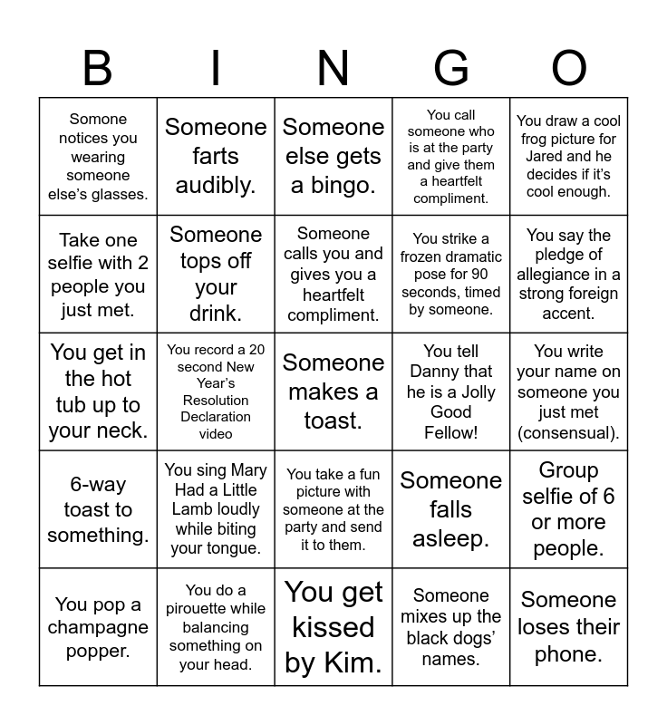 This bingo card has 44 words: Free!, Someone makes a toast., You chug a glass of champagne and burp., You pop a champagne popper., You pop a balloon., Someone mixes up the black dogs’ names., Someone else gets a bingo., You top off someone's drink., You draw a cool frog picture for Jared and he decides if it’s cool enough., You do a pirouette while balancing something on your head., You call someone who is at the party and give them a heartfelt compliment., You tell Danny that he is a Jolly Good Fellow!, You take a fun picture with someone at the party and send it to them., You sing Mary Had a Little Lamb loudly while biting your tongue., You text the neighbor Randy and wish him a Happy New Year., You get kissed by Kim., You make a run to the store., You get in the hot tub up to your neck., Somone squirts whipped cream in your mouth., You say the pledge of allegiance in a strong foreign accent., Someone farts audibly., Someone spills a drink., You dance like no one’s watching with no music (but they are)., Somone notices you wearing someone else’s glasses., Someone you just met signs your body (consensual)., You write your name on someone you just met (consensual)., You steal someone’s drink and they notice it’s missing., Someone drops their food., Someone falls asleep., 6-way toast to something., Someone yells “Where’s my drink?”, Group selfie of 6 or more people., You whisper something scandalous to someone you just met tonight., You sit on someone’s lap., You record a 20 second New Year’s Resolution Declaration video, Someone leaves early., Someone laughs uncontrollably., Someone loses their phone., Someone calls you and gives you a heartfelt compliment., Take one selfie with 2 people you just met., You strike a frozen dramatic pose for 90 seconds, timed by someone., You pretend you are Steve Harvey and host a round of Family Feud., Someone tops off your drink. and Someone argues about a bingo square..