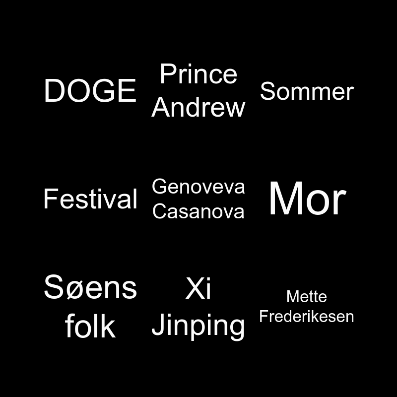 This bingo card has a free space and 53 words: Epstein, Trump, Charlie Kirk, JD Vance, 6 7, Cooked, Prince Andrew, Skål, Mor, Skilsmisse, Søens folk, Breezer, Mokai, Ukraine, 3. verdenskrig, Putin, Xi Jinping, Apanage, Lars Løkke, Mette Frederikesen, Folketinget, Apacha, Elon Musk, DOGE, Prisstigninger, Droner, Ai, Jernmarker, Bollede ham i går, Klima, Preppe, Inflation, Bolig, Viking, Winterberg, Dune, Festival, Fyrværkeri, Sommer, Meme, Folket, Benjamin Hav, Taylor Swift, Gilli, Sabrina Carpenter, Regnskoven, Fitness, Frokost, Forsvaret, Camp Valdemar, Letland, Håndbold and Podcast.