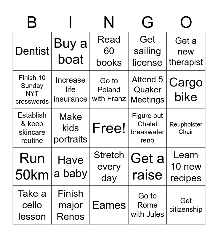 This bingo card has a free space and 24 words: Have a baby, Finish major Renos, Go to Poland with Franz, Take a cello lesson, Get a new therapist, Dentist, Finish 10 Sunday NYT crosswords, Buy a boat, Figure out Chalet breakwater reno, Stretch every day, Attend 5 Quaker Meetings, Establish & keep skincare routine, Get a raise, Learn 10 new recipes, Increase life insurance, Go to Rome with Jules, Reupholster Chair, Read 60 books, Cargo bike, Make kids portraits, Get citizenship, Run 50km, Get sailing license and Eames.
