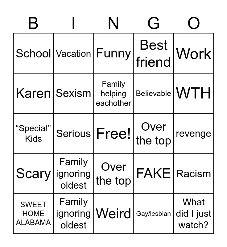 This bingo card has a free space and 24 words: Family ignoring oldest, Family ignoring oldest, Family helping eachother, SWEET HOME ALABAMA, Work, School, Karen, Vacation, Over the top, Over the top, Believable, “Special’’ Kids, FAKE, Racism, Sexism, Gay/lesbian, revenge, Funny, WTH, Serious, What did I just watch?, Scary, Best friend and Weird.