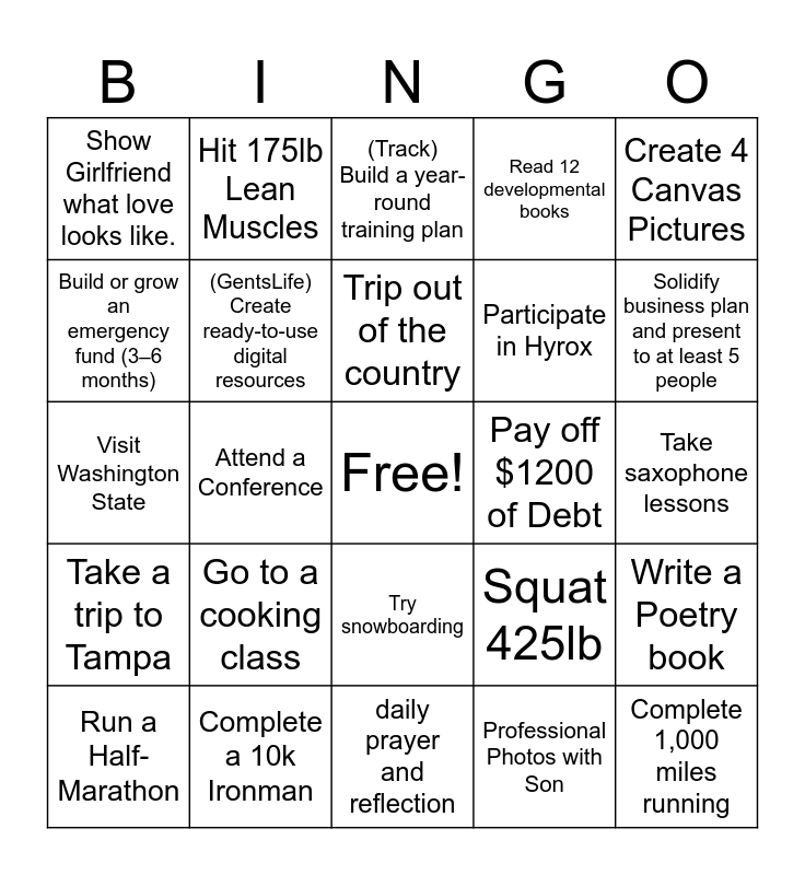 This bingo card has a free space and 24 words: Run a Half-Marathon, Go to a cooking class, Trip out of the country, Professional Photos with Son, Create 4 Canvas Pictures, Show Girlfriend what love looks like., Hit 175lb Lean Muscles, (Track) Build a year-round training plan, Pay off $1200 of Debt, Take saxophone lessons, Visit Washington State, (GentsLife) Create ready-to-use digital resources, Squat 425lb, Write a Poetry book, Build or grow an emergency fund (3–6 months), Complete a 10k Ironman, daily prayer and reflection, Read 12 developmental books, Solidify business plan and present to at least 5 people, Take a trip to Tampa, Attend a Conference, Try snowboarding, Participate in Hyrox and Complete 1,000 miles running.